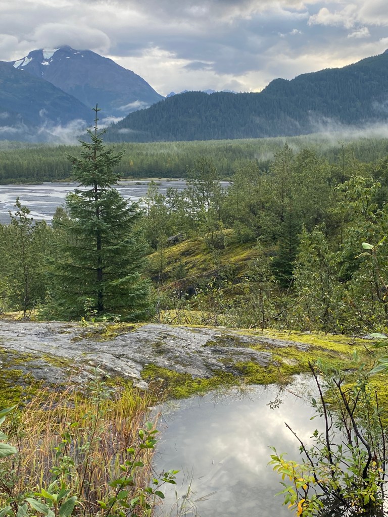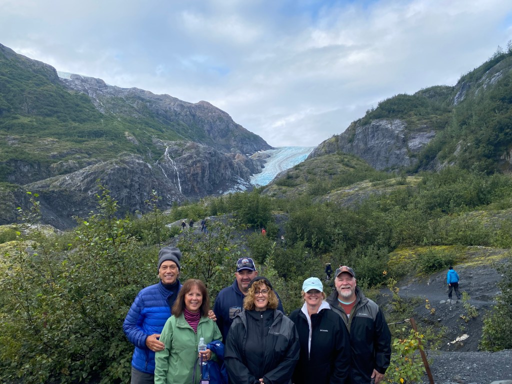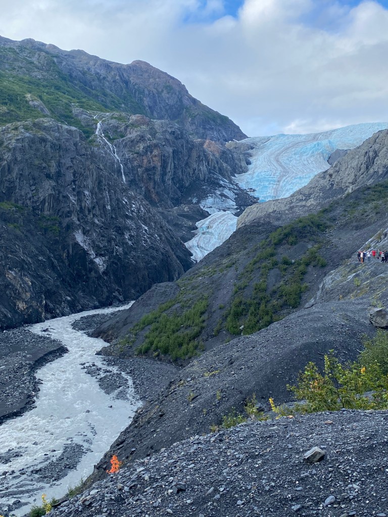 We began the final day of our land tour in Seward. Seward is a small port town in southern Alaska with a population of about 2100 people. It is on an inlet of the Kenai Peninsula and is considered the gateway to Kenai Fjords National Park. There are many glaciers in the area and we took the opportunity hike to one this morning. Our tour guide, Charles, is amazing and asked the driver to bring us, as it was not listed in our itinerary. We hiked the loop trail to the Exit Glacier. It is part of the Harding Ice Field and is named the Exit Glacier because it was where the first expedition to cross the Harding Ice Field exited . The Glacier, unfortunately, is rapidly receding.
