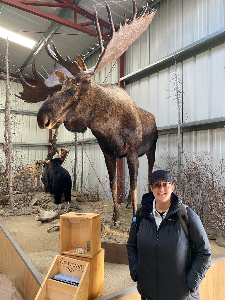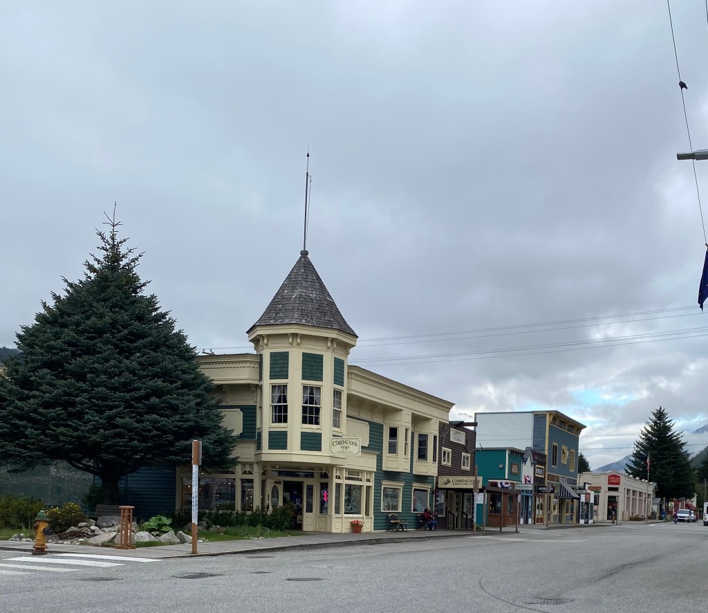 We were fortunate to have a nice driver take us up into the Yukon while we could sit back, listen to him explain the history and enjoy the sights. We traveled across tundra areas , into valleys, and down to lakefronts. It was a long tour, that thankfully included lunch at place called Carcross . They had a few live animals, some mushing dogs and puppies as well as a taxidermy display, which I usually fine unsettling but these were so well done, I was fascinated… Afterward we headed back to Skagway for a bit of walking around downtown.