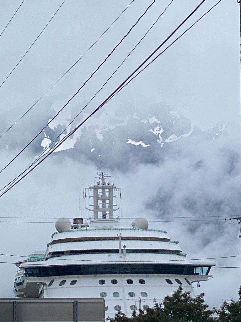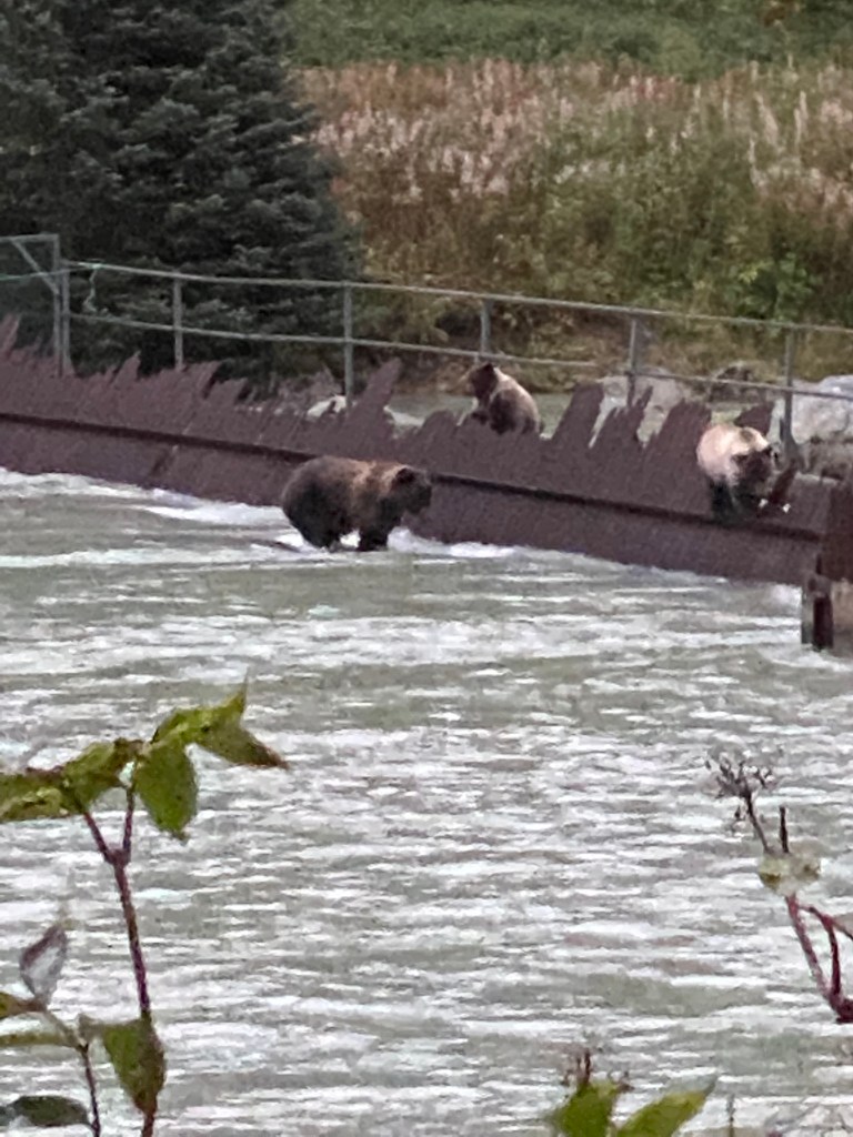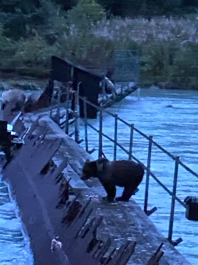 Our excursion was wildlife viewing but the weather was not on our side. We did see a couple of bears on the weir of the Chilkat River. A weir is a device used to control and count the salmon going upstream to spawn. The collection of fish there make it like an all you can eat buffet for the bears! There was a mama bear teaching her two cubs to fish. We also saw some seals in the river feeding o the salmon but the rain brought the darkness on too quickly. Also it made the bus windows fog up making it hard to see. Hopefully tomorrow will be a better day for wildlife viewing ….